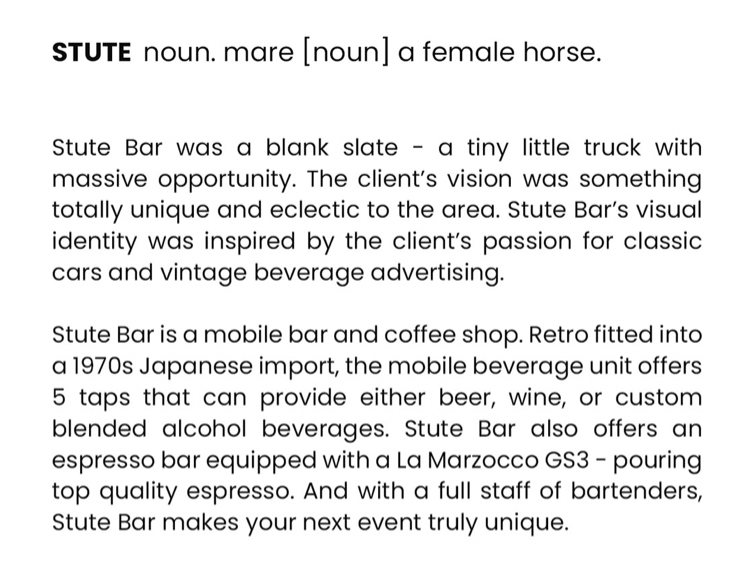STUTE BAR BEVERAGE CO. STUTE BAR BEVERAGE CO. STUTE BAR BEVERAGE CO. —Make your event stand out Our Stute — So small, she can fit anywhere. Let's book! It all begins with an idea.